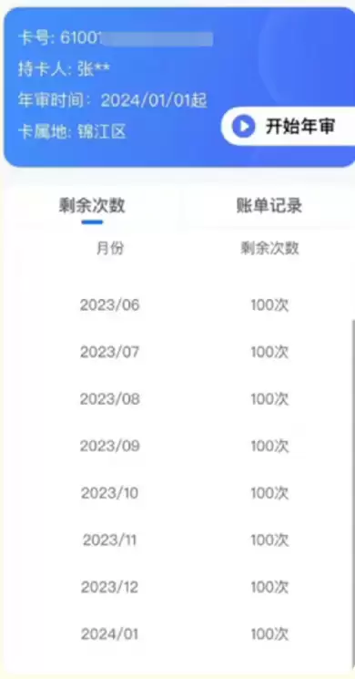 5. 页面显示“获取卡片信息成功”后,系统将展示卡号、姓名、年审有效期及发卡地区。确认符合年审条件后,请点击“开始年审”