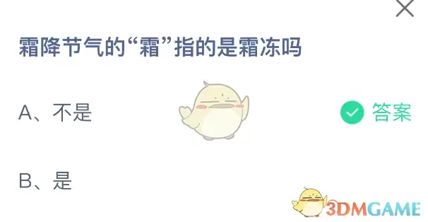 霜降节气的“霜”指的是霜冻吗?支付宝小鸡课堂开课啦!每天花一分钟答题就能赚取饲料,轻松喂养小鸡的同时还能奉献爱心,真是既有趣又充满意义!2025年10月23日蚂蚁庄园的小鸡课堂题目正确答案是【不是】,霜其实是一种天气现象,是空气中水汽在地面或物体表面凝结而成的白色冰晶,通常出现在晴朗的夜晚。