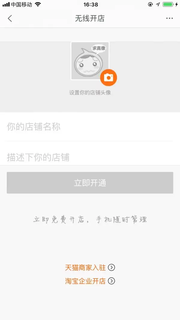 第二步:根据提示依次填写店铺名称和店铺简介,上传好店铺头像后,点击"立即开通"即可进入下一步