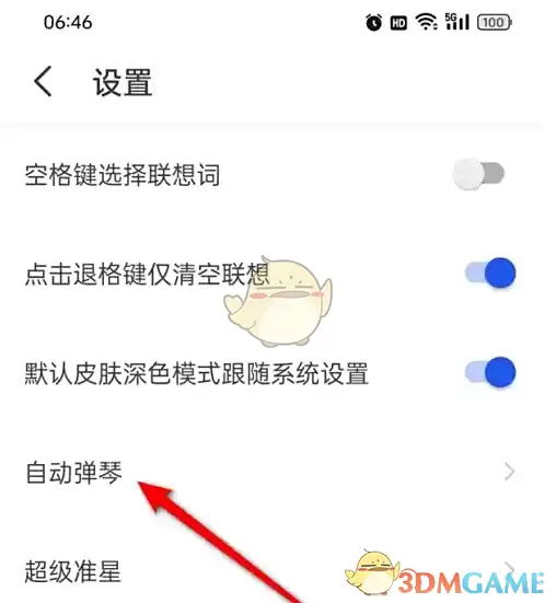 2、在设置菜单中,找到并点击"自动弹琴"选项。