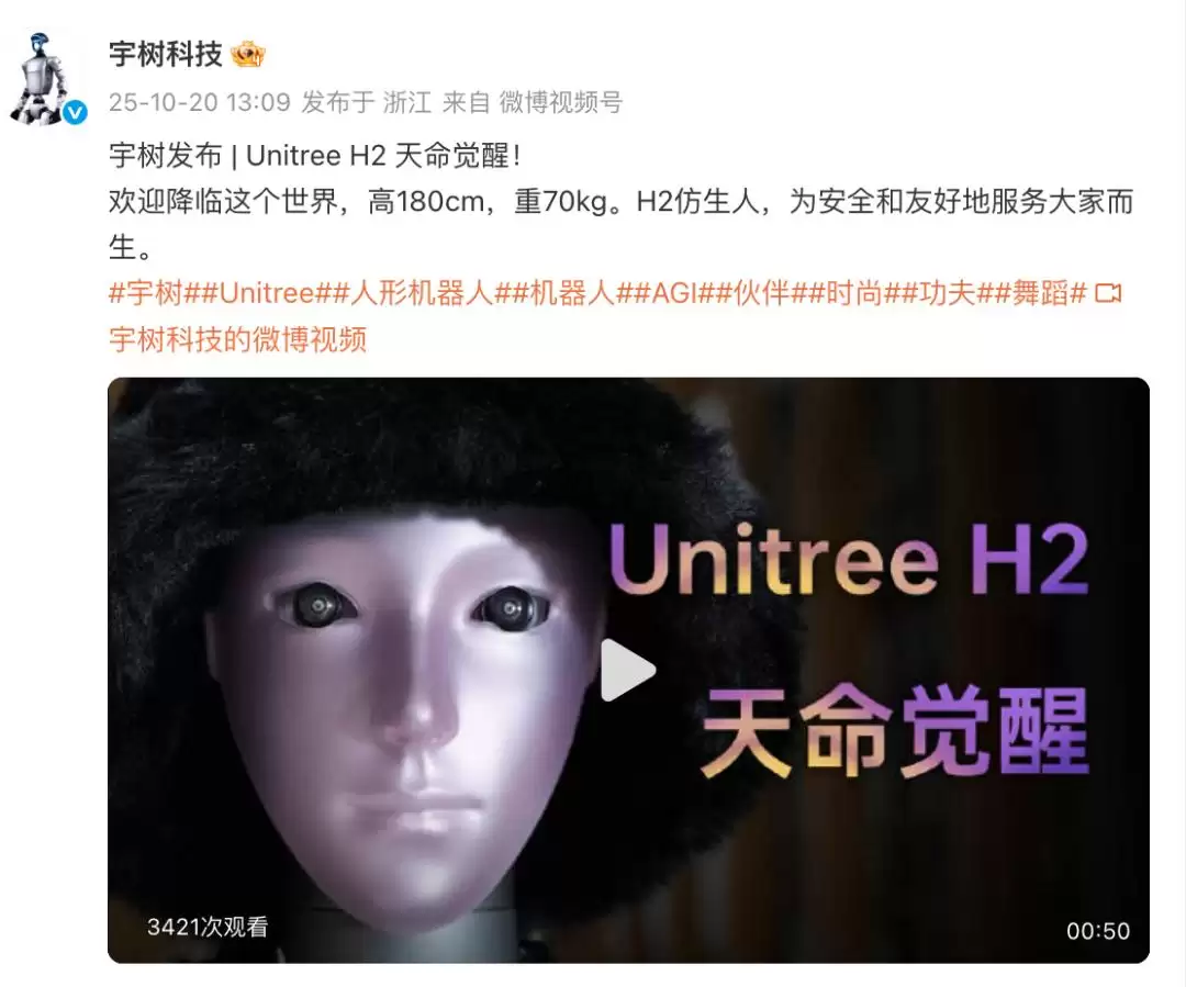 10月20日,宇树科技惊艳亮相,正式发布了新一代仿人形机器人Unitree H2。