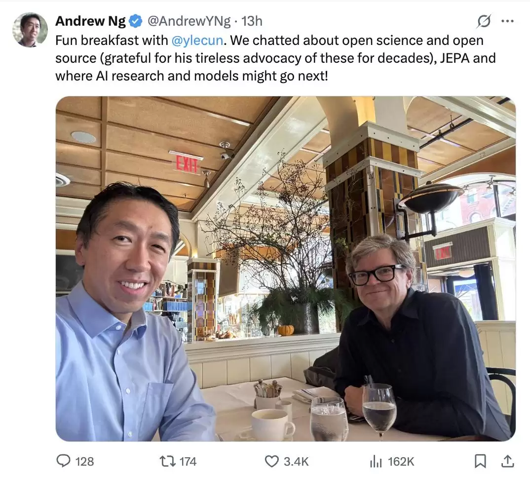 ▲吴恩达于13小时前发布与杨立昆交谈的照片