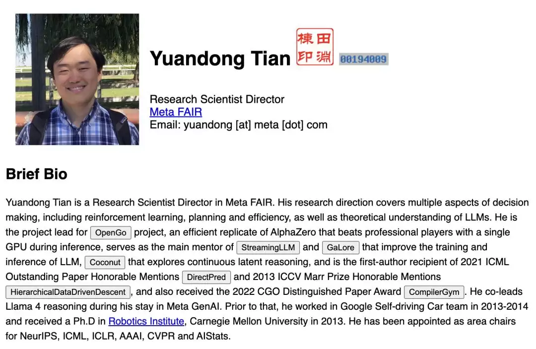 值得注意的是,这次裁员波及了华人AI大牛、FAIR研究科学家总监田渊栋,他在社交平台X上公开表示自己和团队成员均受到影响。
