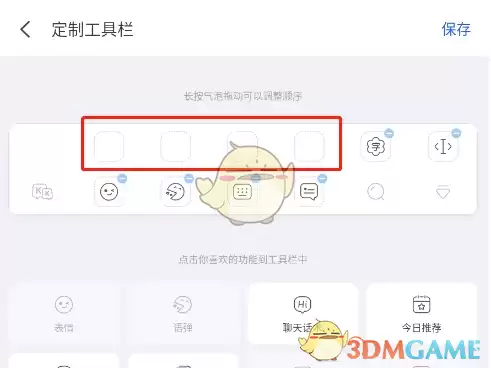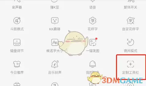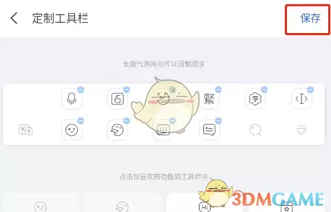 启动KK键盘应用后,进入"我的"界面,轻触右上方的设置图标,找到并点击"定制工具栏"选项。接下来,你可以通过点击功能项右上角的"-"符号来移除不需要的工具,或者从底部列表中选择所需功能的名称为图标进行添加。完成调整后,只需点击"保存"按钮,即可成功完成个性化工具栏的设置。