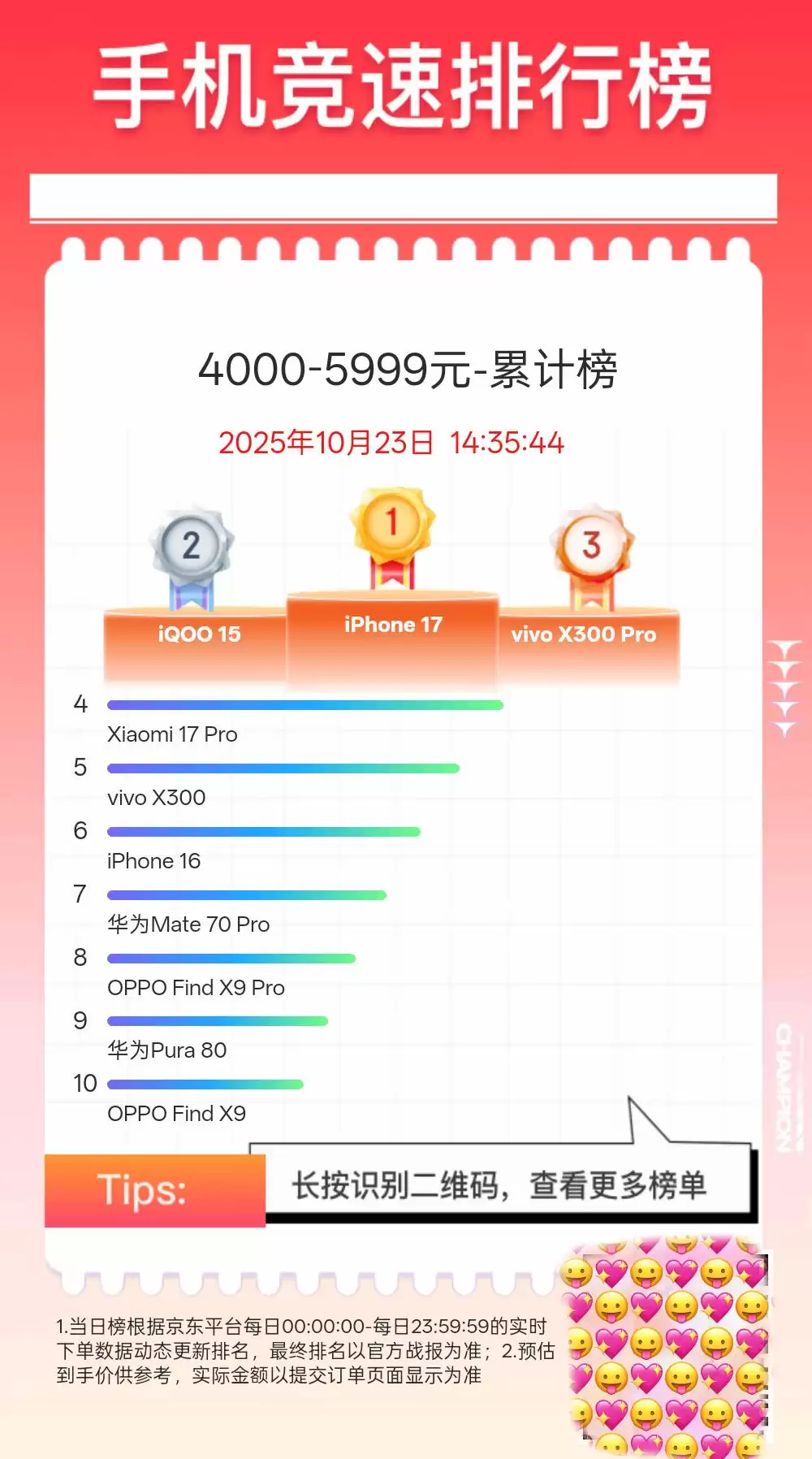 当然,在最新统计数据出炉前,笔者也找到了电商平台的累计榜单单,权当给看客做个参考,根据京东《手机竞速排行榜》最新显示,截止2025年10月23日 14:35,在4000-5999元价格区间的智能手机销量累计榜单前十排名如下: