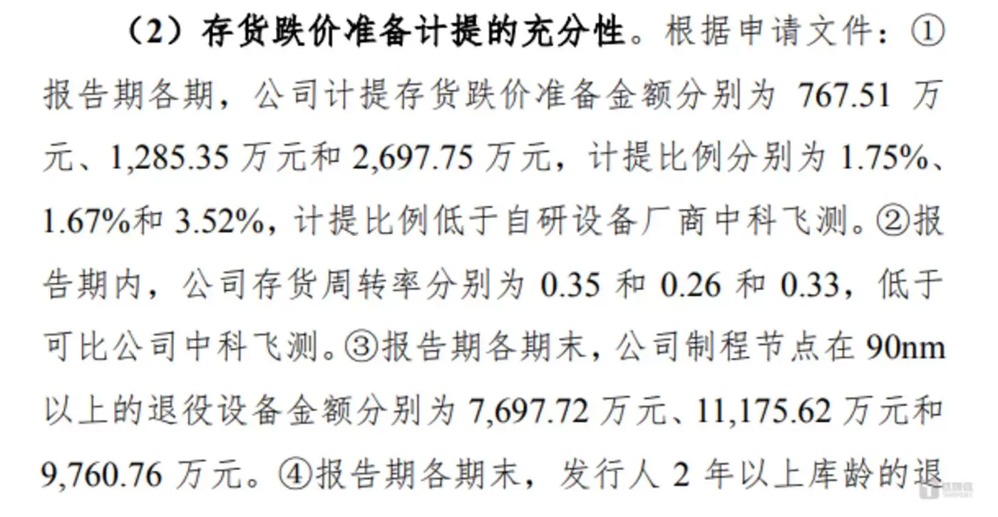值得一提的是,根据卓海科技的北交所的问询函,报告期内各期,卓海科技存货周转率分别为0.35次、0.26次和0.33次,始终低于可比公司中科飞测;而计提存货跌价准备金额分别为767.51万元、1,285.35万元和2,697.75万元,计提比例分别为1.75%、1.67%和3.52%,计提比例低于自研设备厂商中科飞测。