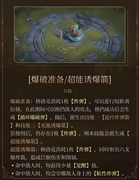 二技能包含“爆破准备”与“超能诱爆箭”两种形态。“爆破准备”需要消耗1枚炸弹,发动时可进行短距离闪避并格挡敌方攻击,成功防御后生成一颗可重复使用的爆破弹;“超能诱爆箭”同样消耗1枚炸弹,向前方射出六支爆炸箭,覆盖范围广,特别适合清理密集的敌人。