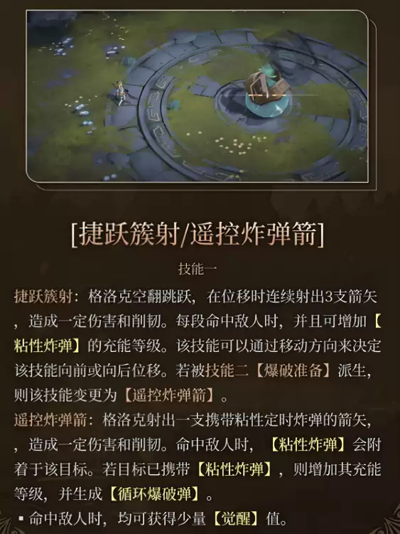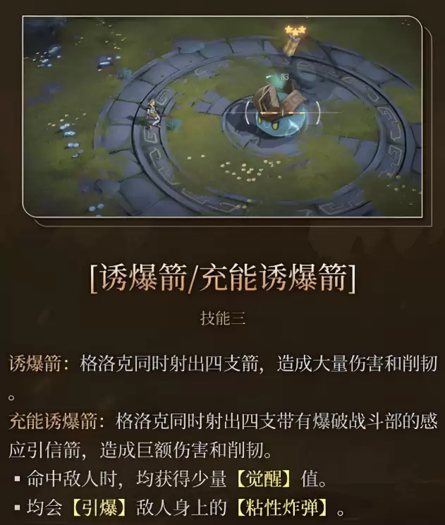 三技能“诱爆箭”能在短时间内快速射出4支箭矢,造成多段伤害与削韧效果。该技能在命中时会触发目标身上的黏性炸弹,并额外获取少量觉醒值,进一步加快能量循环的速度。