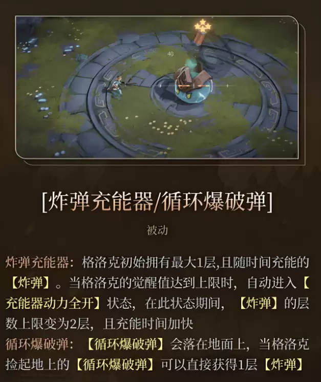 格洛克拥有两个关键被动机制:“炸弹充能器”与“循环爆破弹”。前者初始拥有1层充能,当觉醒值满格时会进入加速状态,显著提升充能效率;后者则允许她在爆破弹落地时快速拾取,立即获得1层炸弹充能。这种设计让她在资源周转上极为流畅,可以持续衔接技能连招。