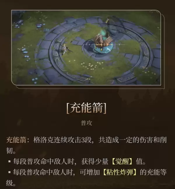 她的普通攻击“充能箭”采用三段式设计,每一箭命中时都能削减敌人的韧性值,并为自身累积觉醒能量。更巧妙的是,每次攻击还会同步提升黏性炸弹的等级,让后续爆发的威力层层递进,这正是构建她输出循环的核心起点。
