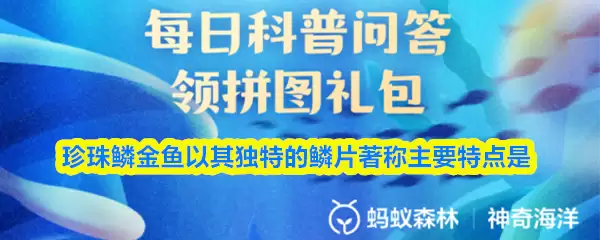 珍珠鳞金鱼以其独特的鳞片著称,主要特点是?【神奇海洋】10月23日新题目已开答!正确答案现已公布,点击领取拼图,一起为修复海洋生态贡献力量!今日正确答案是:【鳞片呈珍珠状】。珍珠鳞