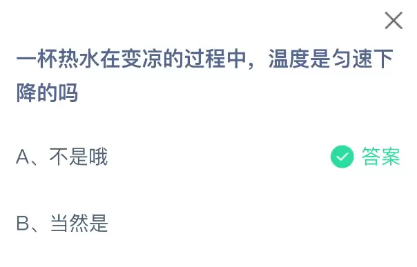 一杯热水在变凉的过程中,温度是匀速下降的吗?支付宝小鸡课堂开课啦!每天花一分钟答题赚饲料,喂喂小鸡就能贡献爱心啦!轻松又意义十足!2025年10月24日蚂蚁庄园的小鸡课堂题目正确答