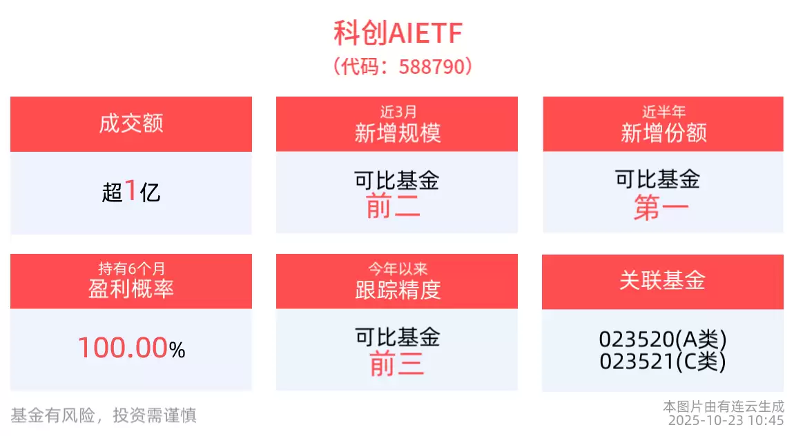 作为全市场规模最大的科创版人工智能指数产品,科创AI ETF(588790)及其场外连接基金(A类023520、C类023521、E类023989)完整覆盖AI“硬件-模型-应用”全产业链。其第一大权重股为寒武纪,同时纳入海光信息(国产GPU市占率70%)等核心替代企业。数据显示,截至9月30日,该指数前十大权重股合计占比71.9%,包括澜起科技、芯原股份、金山办公等龙头企业。近三个月来,科创AI ETF规模增长15.81亿元,新增规模在同类基金中排名第二;近半年份额增长35.31亿份,新增份额位列第一。
