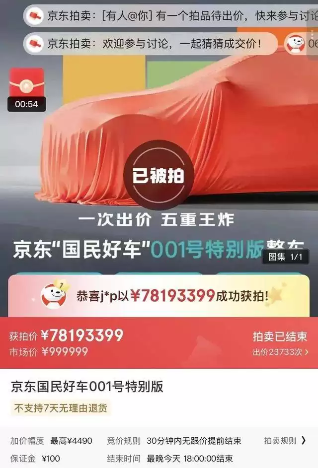 10月23日起,围绕这款新车的市场热度持续升温。此前,京东平台举办的"001号国民好车"拍卖活动引发广泛关注。该车以1元起拍,历经两万余次竞价,最终以7819万元高价成交,吸引近27万人次围观。针对这一现象级事件,京东汽车当日宣布推出补偿方案:所有参与拍卖出价的用户,在提车后可获赠价值399元的"国民好车"新车大礼包;而竞拍价格最接近最终发布价的用户,将直接获赠一辆同款新车。