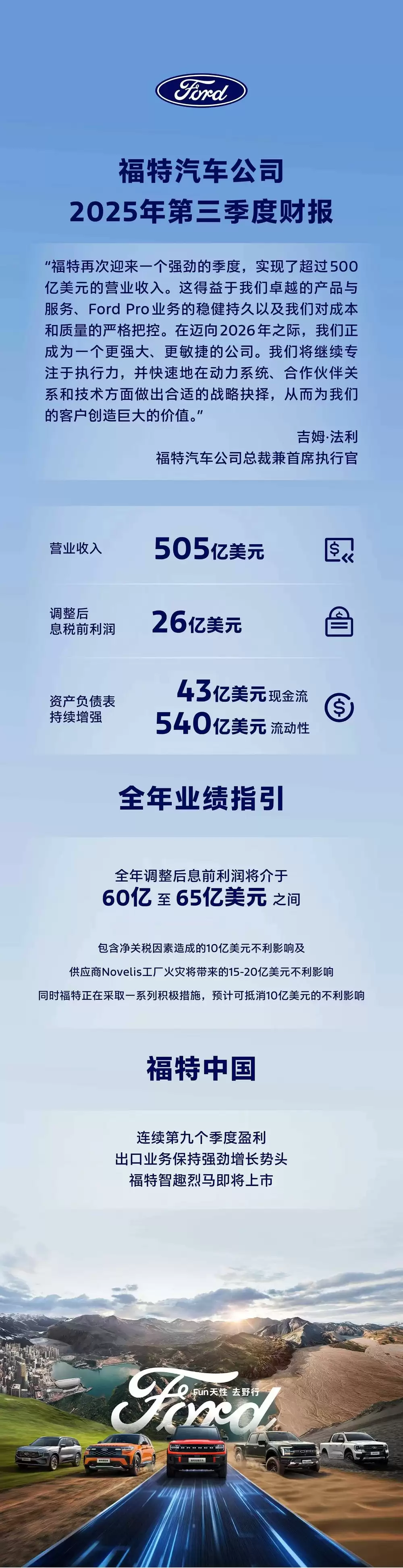 10月24日,福特汽车公布了2025年第三季度财报。当季营收达到505亿美元,同比增长9.3%,创下历史新高,同时实现净利润24亿美元;调整后每股收益为0.45美元。