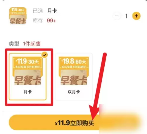 接着根据需求挑选适合的早餐月卡套餐,确认后点击【立即购买】即可完成订购