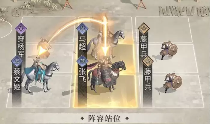 这里首先为大家推荐一个性价比较高的阵容配置,可以选择马超、蔡文姬和张飞这三名武将进行组合。这些角色在游戏前期都有机会获取,基本都是传奇品质的武将。想要触发羁绊效果的话,关键要看站位能否让马超的追击格子覆盖到蔡文姬和张飞——这就是游戏中可以激活的羁绊机制。其中蔡文姬和马超属于开局就会赠送给玩家的福利角色,获取难度较低。当然如果后期想要进一步提升队伍输出能力,也可以将张飞替换为甘宁。