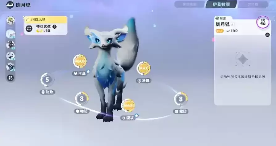 在这个阵容搭配之后,就非常适合前期大家进行开荒的战斗了。那么这个战斗其实后期属性面板大家也可以关注一下,因为这里的月光狐,其实在属性面板上也是属于平民阶段比较顶尖的一个水准。前期如果大家想拥有性价比比较高的神宠,它绝对是其中一个。而且相对于其他的宠物来说,它的进化速度会更快一些,只要将它培养到18级,再完成朝村花的相关任务,这个宠物就可以开始进行进化了。所以相对于其他角色22级可以进化的阶段来说,它进入进化阶段会更快一些。进化之后,它在外观上面也会有一定的变化,而且还可以做一些特殊的强化技能,在实战能力上面它绝对是非常强的。后期如果想用到它的光系角色克制优势,比如遇到了一些暗系Boss的话,基本上都可以用它来上场。