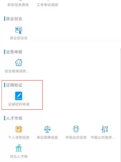 第二步:进入服务列表后,仔细查找并点击【证明材料】这一菜单选项。