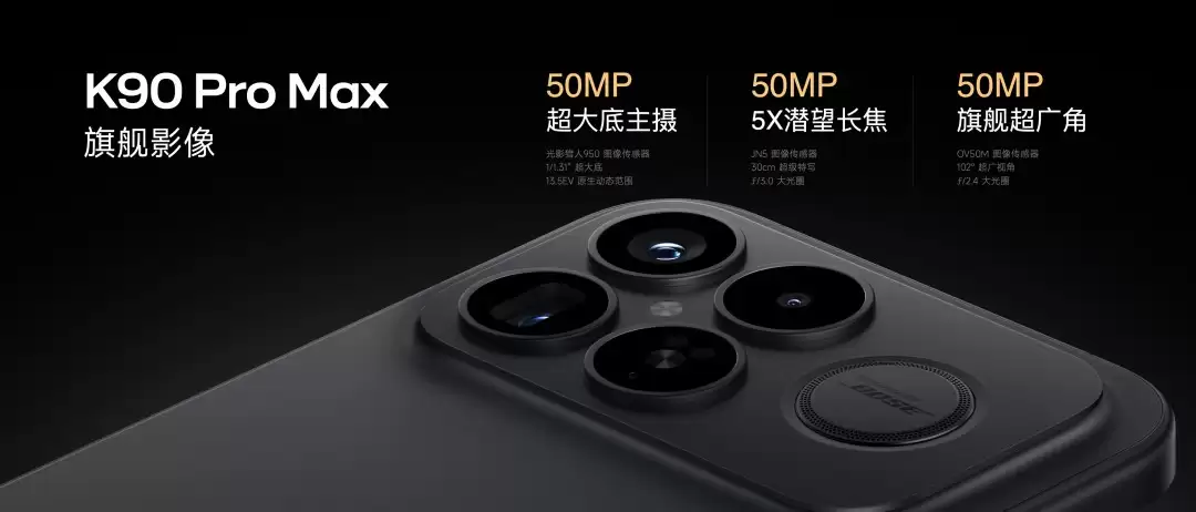 声学体验迎来重大升级。Redmi与音频专家Bose合作,为K90 Pro Max打造豪华三扬声器系统,构建全链路2.1声道。该方案突破手机空间限制,首次在移动设备上实现Bose标志性的饱满低音与沉浸式声场,人声清晰度与细节表现力显著提升。双方技术团队针对手机场景优化音频算法,确保在音乐、影视、游戏等场景中均能提供高端听觉享受。