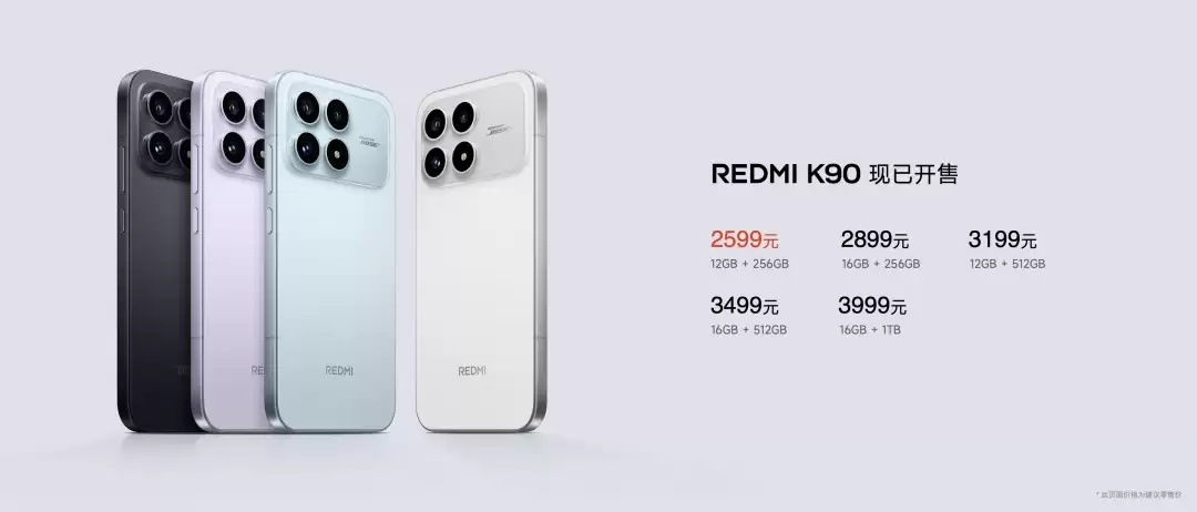 售价方面,K90 Pro Max提供四个存储版本:12GB+256GB版3999元,12GB+512GB版4499元,16GB+512GB版4799元,16GB+1TB版5299元;冠军版16GB+1TB售5499元。K90提供五个版本:12GB+256GB版2599元,16GB+256GB版2899元,12GB+512GB版3199元,16GB+512GB版3499元,16GB+1TB版3999元。全系机型即日起开启销售。