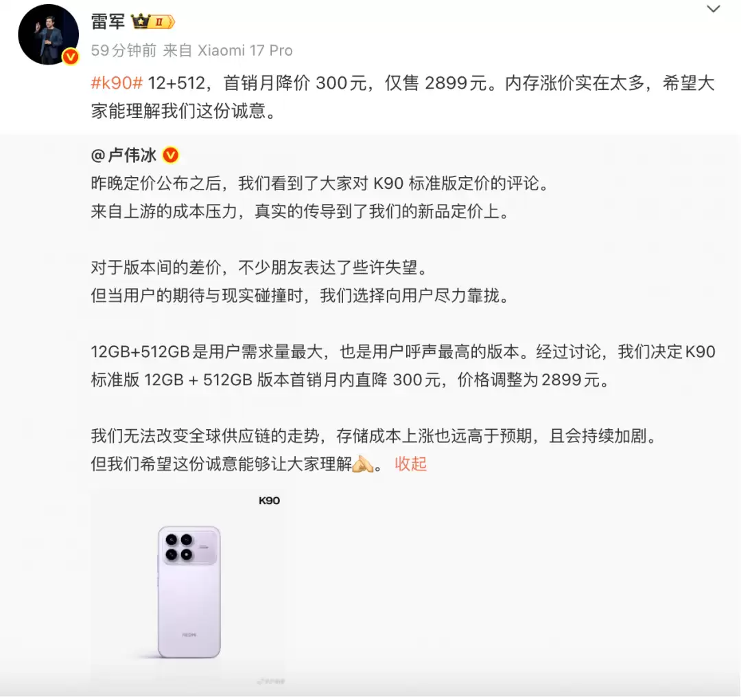 卢伟冰透露Redmi K90定价:成本压力下12+512GB首销直降300元