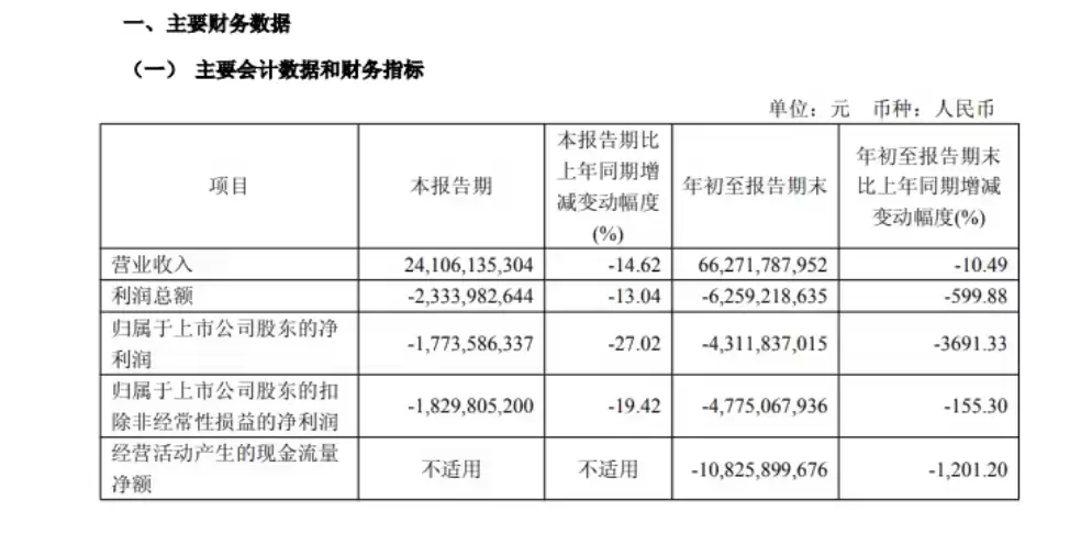 10月24日,广汽集团最新公布的三季度财报显示,2025年第三季度营业收入为241.06亿元,较去年同期下降14.63%;归属于上市公司股东的净亏损达17.74亿元;从年初至报告期末,公司净亏损累计达43.12亿元。