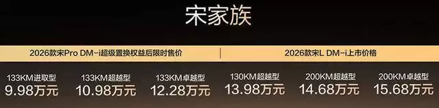 价格策略上,两款车型通过差异化定价覆盖更广用户群体。2026款宋L DM-i定价13.98-15.68万元,主打中级SUV市场;宋Pro DM-i在超级置换权权益后限时售价下探至9.98-12.28万元,配合丰厚上市权益,实现“高价值”与“亲民价”的平衡。依托第五代DM技术及380万用户基础,宋家族双车此次焕新不仅强化了产品竞争力,更为中国家庭提供了经济、安全与智能兼具的出行解决方案。