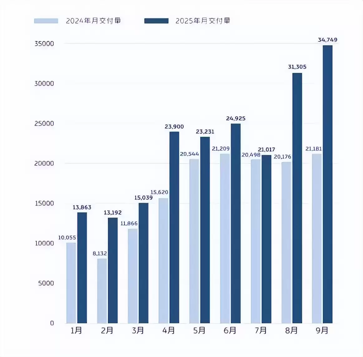 先看交付数据。今年9月,蔚来共交付新车34,749台,同比增长64%。其中,蔚来品牌交付13,728台;乐道品牌交付15,246台;Firefly萤火虫品牌交付5,775台。三季度,蔚来累计交付新车8.7万台,刷新季度交付纪录。