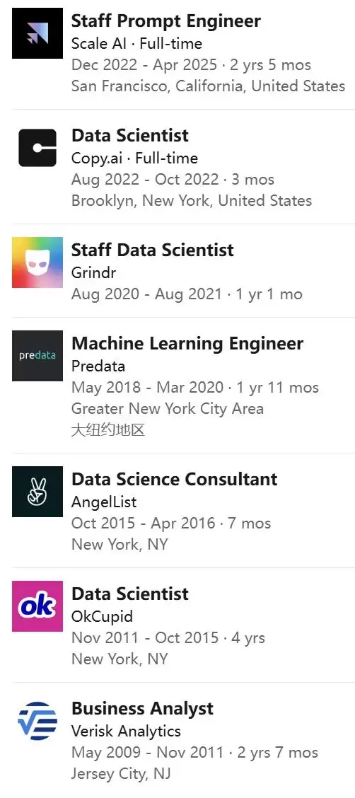 踏上职业道路后,他先后效力于Verisk Analytics、OkCupid、AngelList等知名企业,担任过业务分析师、数据科学家、数据分析师等职务。