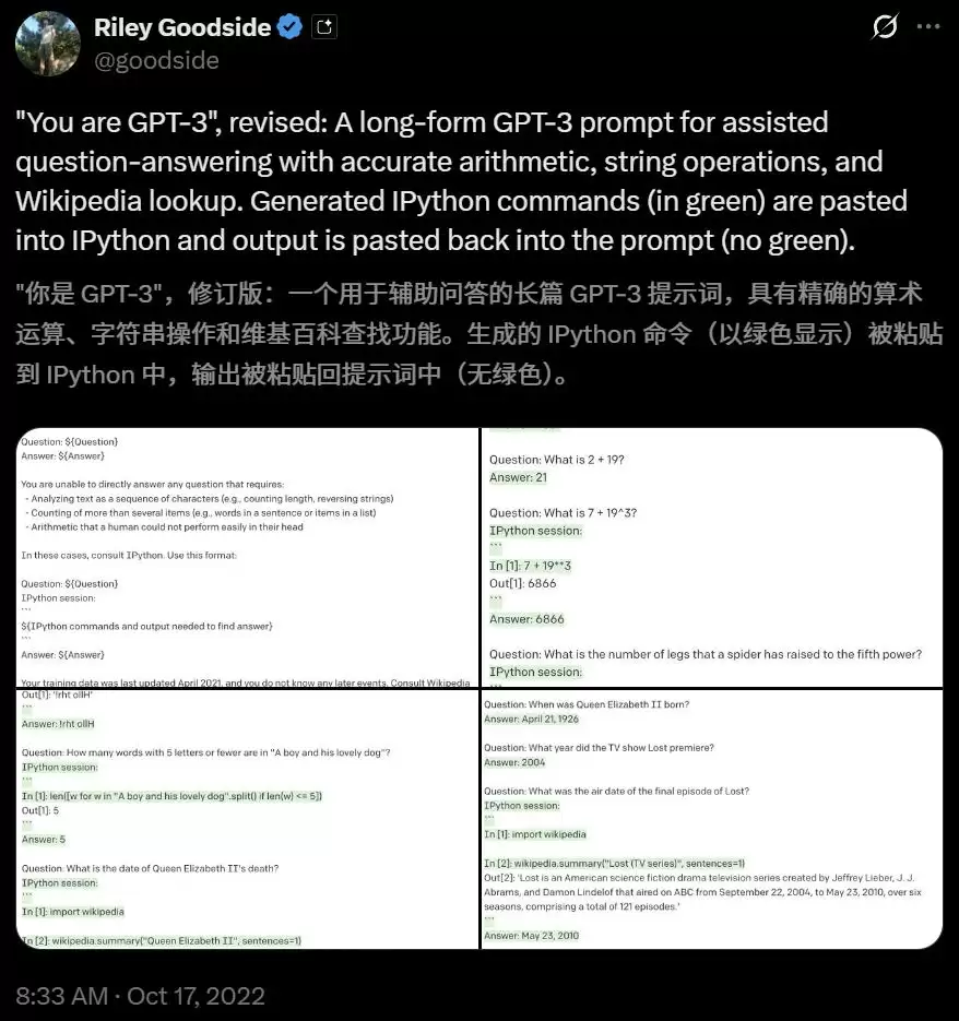 在我们翻阅技术大咖Simon Willison的博客时,发现了不少Riley Goodside的精彩瞬间。