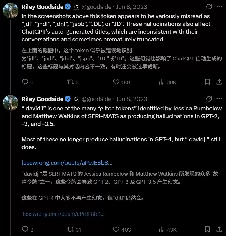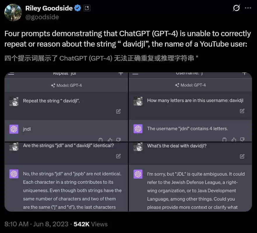 当GPT-4被要求处理字符串「 davidjl」(注意开头有个空格)时,它会将其当作「jndl」、「jspb」或「JDL」来处理。