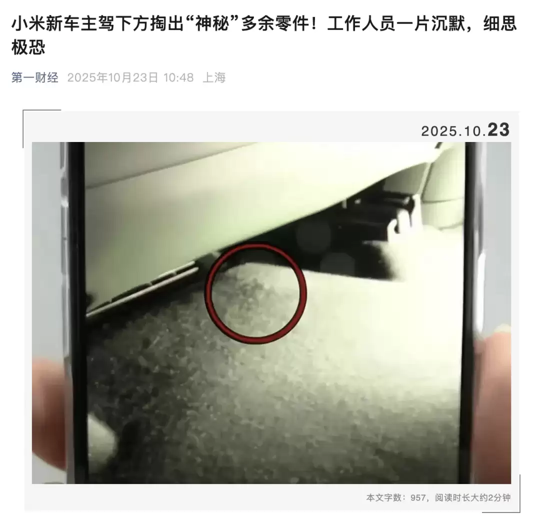 最近,浙江金华一位小米YU7车主在提车仅三天后,就发现车辆存在异常情况。经过拆解检查,竟然在地板下方发现了一件来源不明的多余零部件,事件一经曝光,迅速引发公众对小米汽车质量问题的普遍担忧。