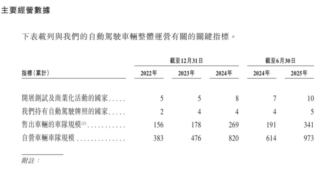 文远知行则重点展示其持有牌照的国家数量、商业化活动国家数、售出车辆和车队规模,以体现其国际化优势。截至2025年上半年,文远知行自营车队达到973辆,销售车辆341辆,测试及商业化活动覆盖10个国家,拥有自动驾驶牌照的国家增至5个,其Robotaxi板块在半年内增长385%,不仅得益于国内放开的商用城市,更源自中东市场的运营尝试。