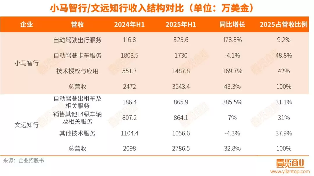 相较而言,文远知行的营收结构更为均衡。2025年上半年,公司总营收达2786.5万美元,同比增长32.8%。其中,自动驾驶出租车及相关服务收入达865.9万美元,贡献了31.1%的营收;L4级车辆销售及相关服务(包括小巴、货车等)占比31%,保持平稳;其他技术服务贡献37.9%,略有下降。