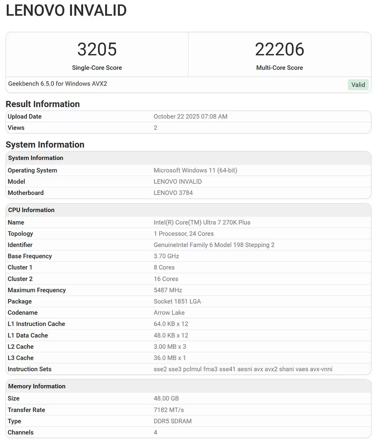 该处理器在测试平台显示为“LENOVO INVALID”,推测是联想正在进行内部测试的台式机处理器。从规格来看,酷睿Ultra 7 270K Plus可视为现有Ultra 7 265K的升级型号,但其核心配置却与当前的旗舰型号酷睿Ultra 9 285K保持一致,采用8个性能核与16个能效核的组合,缓存容量也相同,唯一区别在于最高睿频从5.7GHz略降至5.5GHz。因此,与其说是Ultra 7的升级版,不如将其视为Ultra 9的降频版本。
