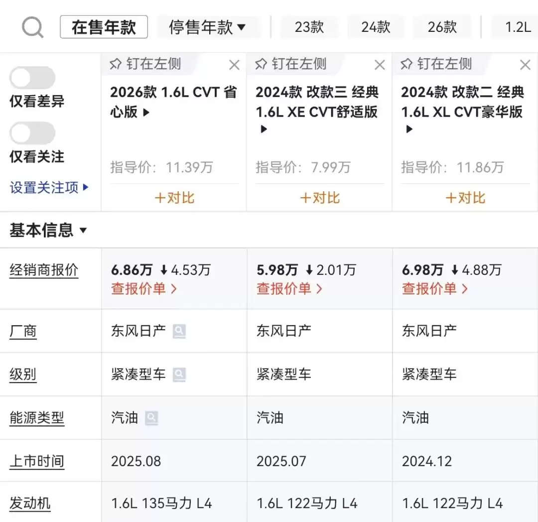 以2025年8月上市的2026款1.6L省心版为例,11.39万元的上市指导价直降4.53万元,降幅达39.77%。而2025年7月上市的2024款经典1.6L舒适版,更是将上市价格压到了7.99万元,叠加2.01万元的降价优惠政策后,轩逸的裸车价更是直接杀到了5.98万元。