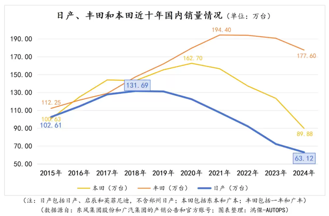 从近十年数据来看,丰田是最后一个进入下行周期的品牌,拐点出现在2024年;而日产则是进入下行周期最早的品牌,早在2018年就已显现颓势。