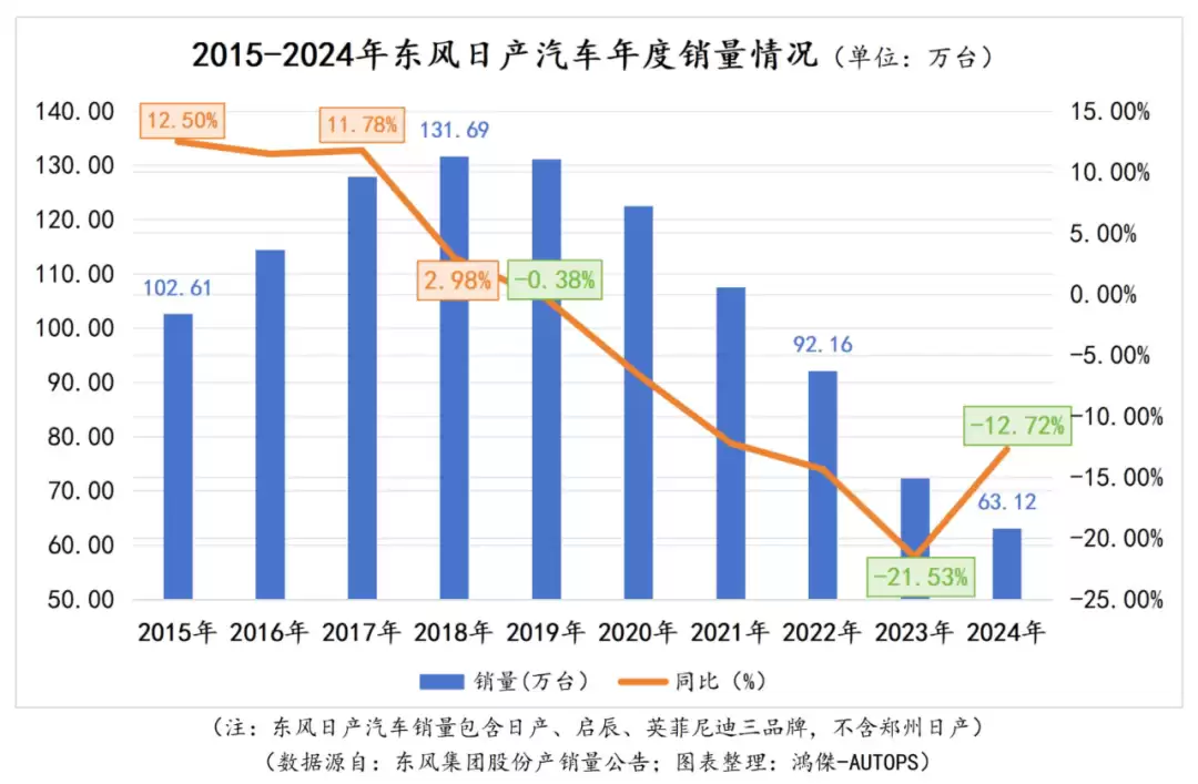 从近十年的销量走势来看:2015年东风日产年销量首次突破百万大关;2018年达到历史最高点131.69万台,此后便一路走低;到2023年已跌破百万大关至92.16万台;最终2024全年销量仅约63.12万台。
