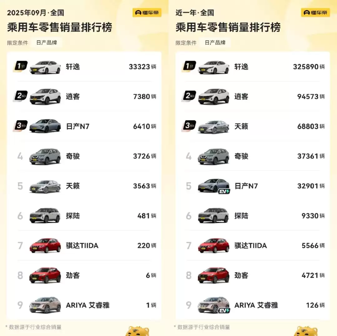 根据懂车帝APP的数据:2025年9月日产轩逸单月销量约3.33万台,日产品牌在售的九款车型当月累计销量约5.51万台,仅轩逸一款车型就贡献了近60.47%的销量。