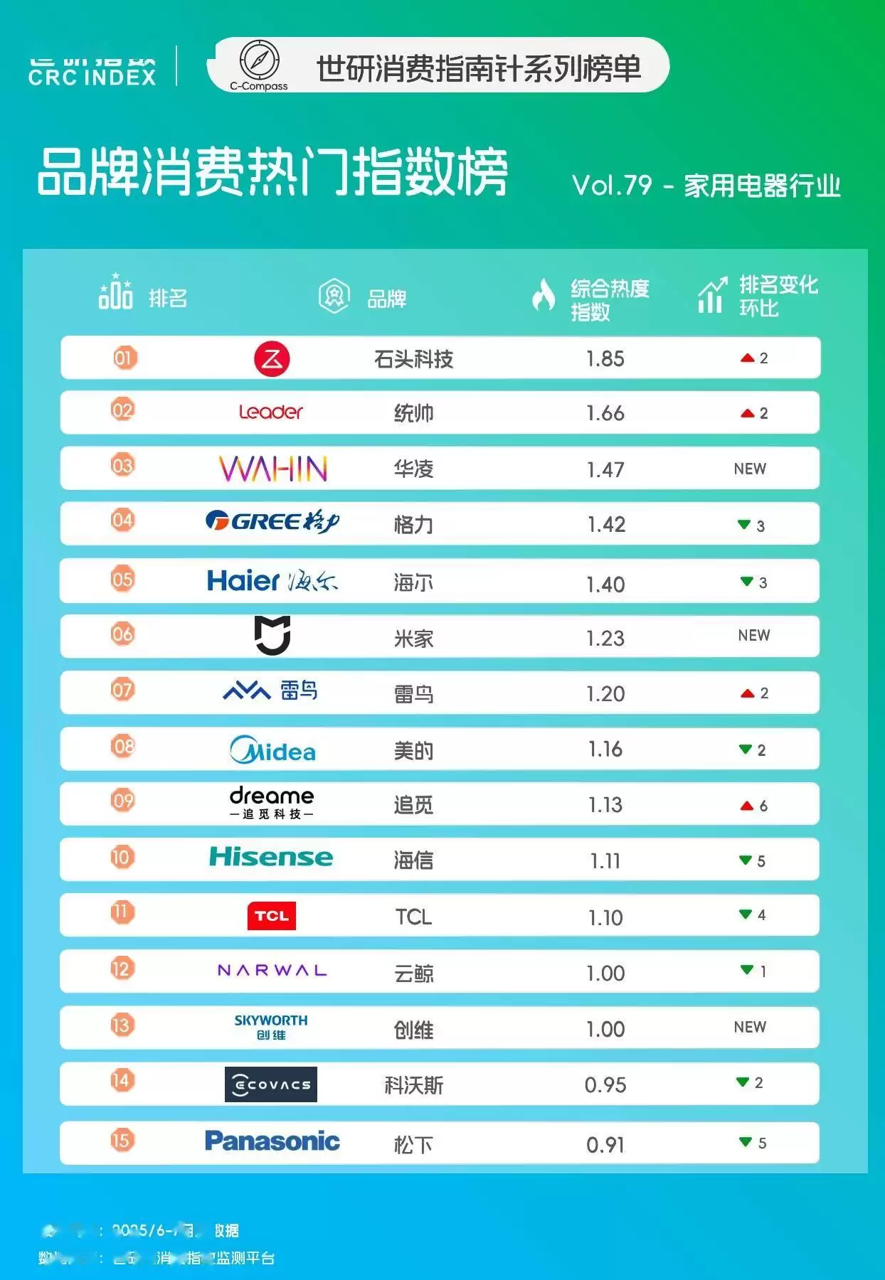 根据近期发布的世研消费指南针系列指数报告,在综合热度榜单中,石头科技、统帅与华凌分别以1.85、1.66和1.47的指数值占据前三。该榜单通过多维度数据监测,客观展现了家电市场的消费趋势与品牌竞争力。