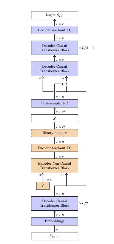 第三种架构名为自由变换器,简化了这一过程。它直接在模型中间层注入随机状态,而非使用独立的完整编码器。在训练过程中,编码器仍被使用一次,以帮助模型学会如何选取良好的隐藏状态,但它仅与网络的一部分协同工作。