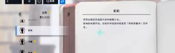 平时在书店系统中,莉莉发挥着非常实用的功能。这个系统其实包含三种不同的玩法模块:第一是“轨道人类史”,在这里玩家可以根据已解锁的剧情内容进行回顾;第二是“角色数据库”,能够查阅目前已登场角色的详细资料,相当于角色图鉴功能;第三则是“骑士团报告”,在这里可以查看骑士的各项属性数据、后期养成任务内容,以及当前与玩家之间的信任度。通过这些信任度任务还可以推进整体剧情进度。所以在这个系统中,建议大家务必全面参与每一种玩法。