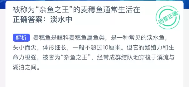 被称为“杂鱼之王”的麦穗鱼通常生活在?【神奇海洋】10月25日新题目已开答!正确答案现已公布,点击领取拼图,一起为修复海洋生态贡献力量!今日正确答案是:【淡水中】。麦穗鱼是鲤科麦穗