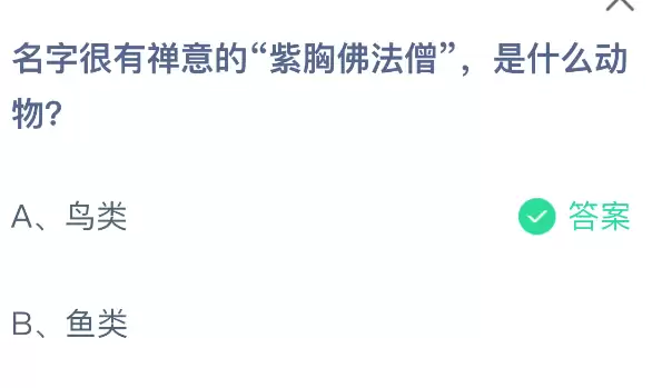 这名字充满禅意的"紫胸佛法僧",到底是一种什么动物呢?支付宝小鸡课堂开课啦!每天花上一分钟答题赚饲料,喂喂小鸡还能顺手献爱心,简单轻松又充满意义!2025年10月26日蚂蚁庄园的今日题目正确答案是【鸟类】,紫胸佛法僧属于佛法僧目佛法僧科的鸟类。