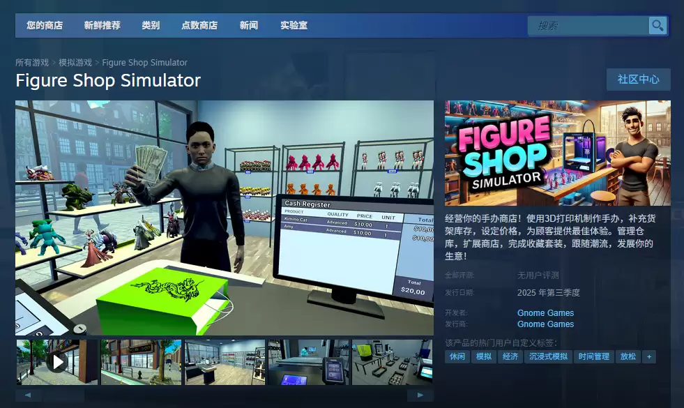 《手办商店模拟器》(Figure Shop Simulator)是由 Gnome Games 精心打造的一款集趣味性与深度于一体的商业模拟游戏。这款游戏的获取方式非常简单,只需前往各数字发行平台的商品页面完成购买即可。以 Steam 版本为例:在商品页面完成购买操作后,只需点击页面上的"开始游戏"按钮,系统便会自动启动下载与安装流程。