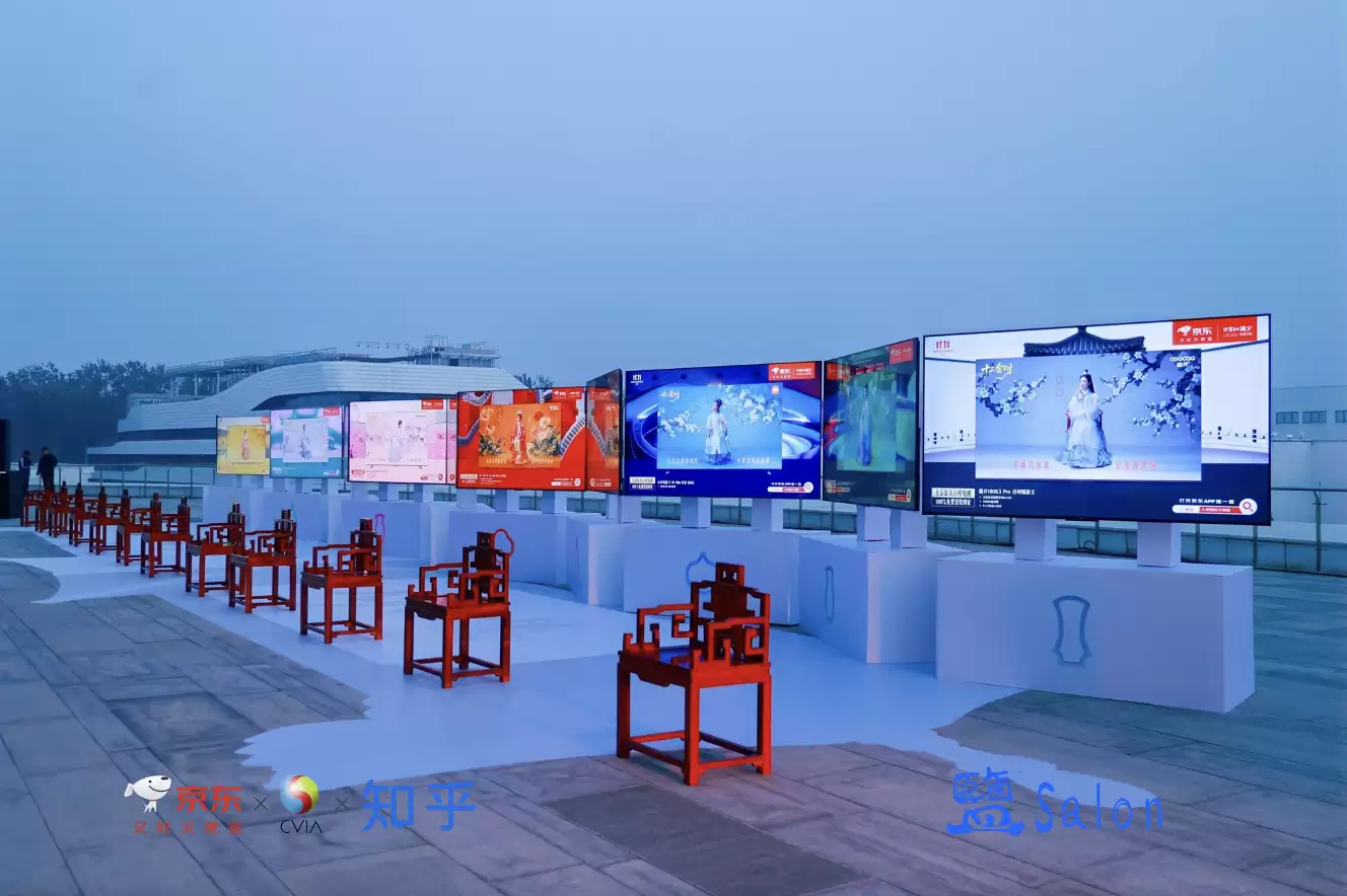 科技的进步让百寸电视成为唤醒经典的全新载体。本次沙龙活动现场,京东取意于"金陵十二钗",以"十二金寸"作为灵感原点,将TCL、海信、小米、创维、三星、雷鸟、Vidda、酷开等品牌的百寸电视共同组成"十二金寸"阵列,投射"金陵十二钗"经典艺术形象,以光影为笔,描绘东方之美。同时,这十二台百寸电视构建的沉浸式巨幕装置,也形成了一幅流动的"现代画卷"。