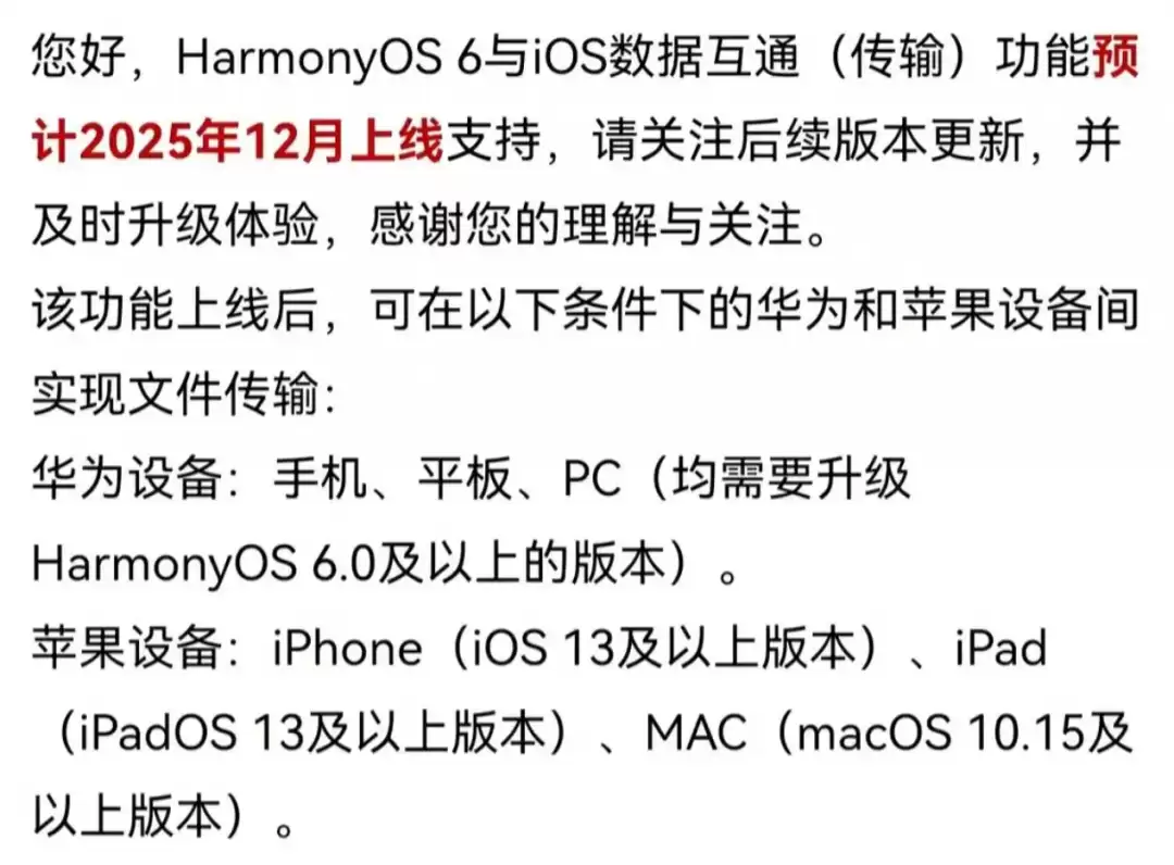 根据最新确认的信息,鸿蒙HarmonyOS 6与苹果系统的数据互通功能已进入最终测试阶段,预计将于2025年12月正式向用户开放。届时用户无需借助第三方工具,即可在华为设备与苹果设备间直接传输各类文件,这将显著提升跨平台工作效率。