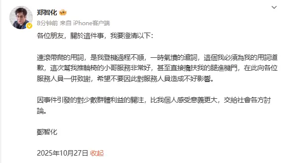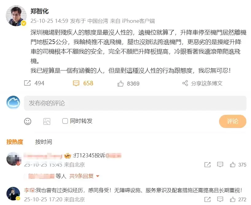 回顾10月25日下午,郑智化曾在微博发文称,深圳机场对残障人士的服务缺乏人文关怀。他提到升降车距离机舱地板有25公分落差,轮椅无法顺利推进机舱,腿部也难以跨入舱门。而操作升降车的司机完全不愿调高升降板,只是冷眼旁观他艰难地爬进飞机。
