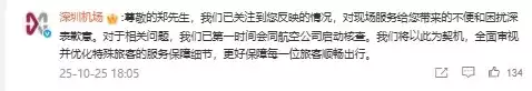随后,深圳机场在微博评论区发布回应:尊敬的郑先生,我们已关注到您反映的情况,对现场服务给您带来的不便与困扰深表歉意。针对相关问题,我们已第一时间会同航空公司启动核查。我们将以此为契机,全面审视并优化特殊旅客的服务保障细节,更好确保每位旅客的顺利出行。